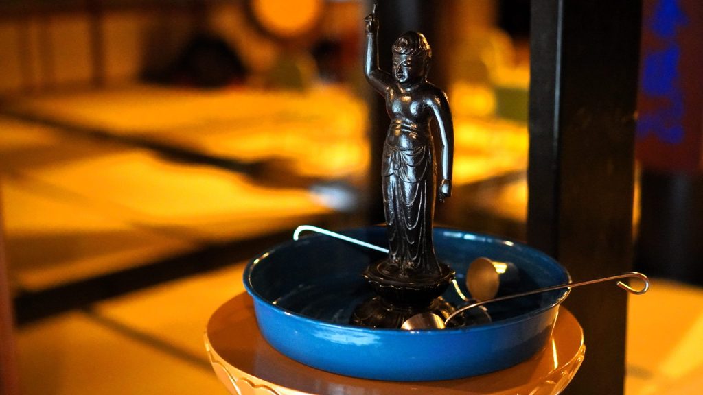 誕生仏(たんじょうぶつ)という、赤ちゃん姿のお釈迦さまの像に甘茶をそそぐ作法をいたします。