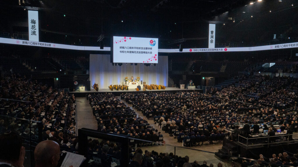 2年にいちど行われる全国奉詠大会は、全国各地から梅花講員さんが集まり、日頃の研鑽の成果を披露する大発表会です。本年は終戦80周年に因み、沖縄県が会場となり平和祈念法要も併せて執り行われました。