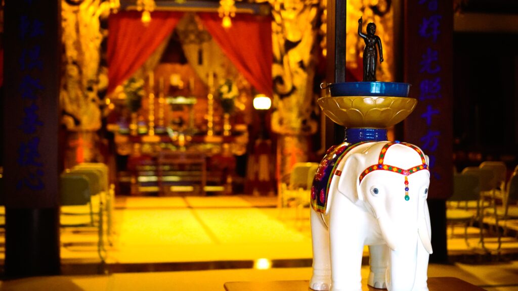 『お釈迦さまのご生誕を喜んだ天の龍が、甘い雨を降らせた』という言い伝えにならい、誕生仏(たんじょうぶつ)という、赤ちゃん姿のお釈迦さまの像に甘茶をかける作法をいたします。